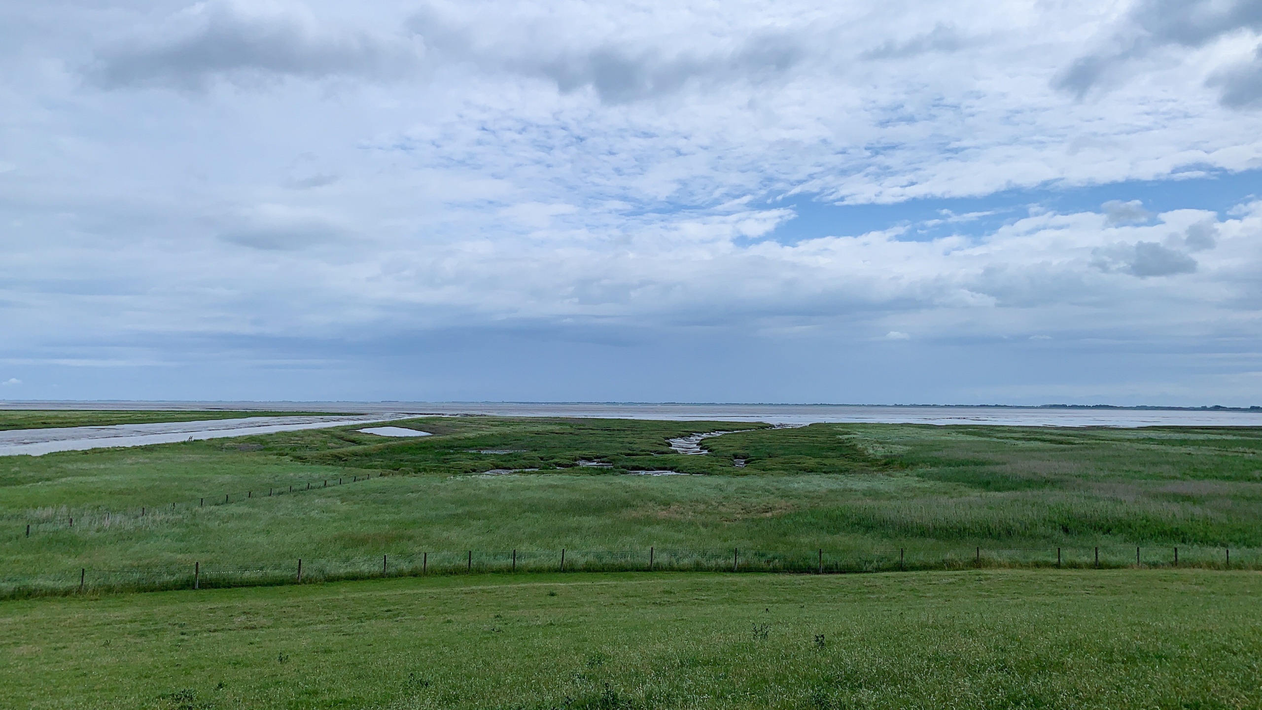 Da der Vareler Hafen aus zwei Teilen besteht, fährt man noch einige Minuten an Feldern und Kuhwiesen vorbei bis man den Deich sieht und beim zweiten Anlegeplatz ankommt. Von hier aus kann man die andere Seite des Jadebusens sehen und bei Flut auch das Meer.