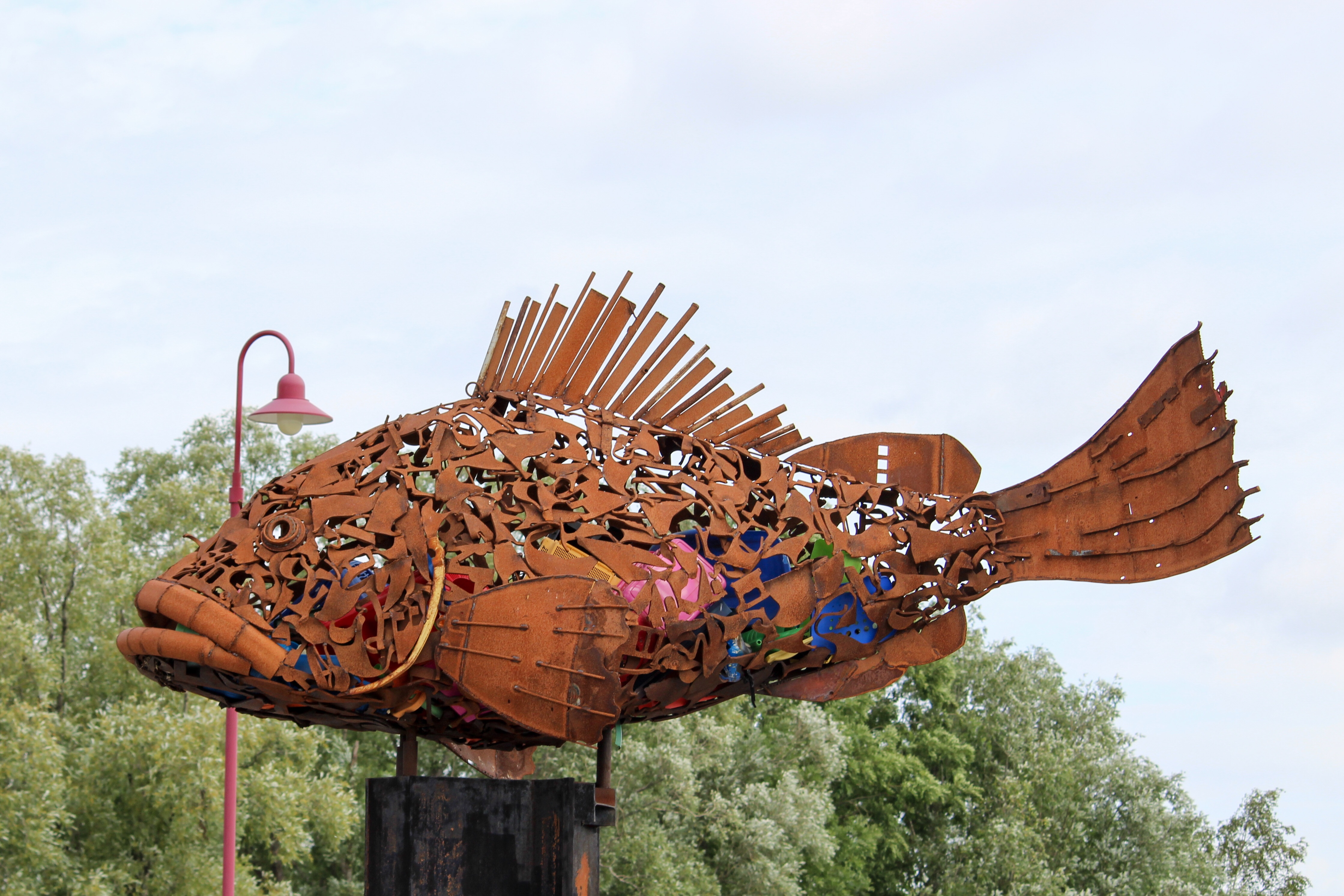 Am Hafen befindet sich diese Skulptur mit dem Titel „Future Fish“, die auf die Verschmutzung der Meere aufmerksam macht.